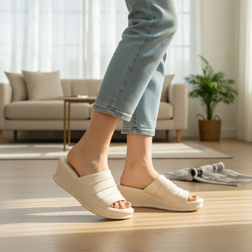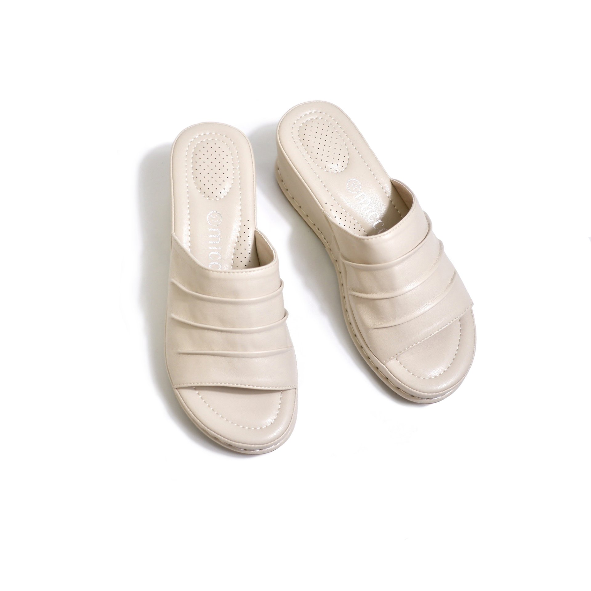 รองเท้าลำลองเสริมส้นสไตล์มินิมอล ดีไซน์สายคาดหน้าพลีทเล่นเลเยอร์สุดหรู เพิ่มประกายเงางามเมทัลลิก ให้ลุคดูโดดเด่นแต่ยังคงความเรียบง่าย พื้นรองเท้าบุนุ่มรองรับแรงกระแทก ใส่สบาย เดินได้ทั้งวัน